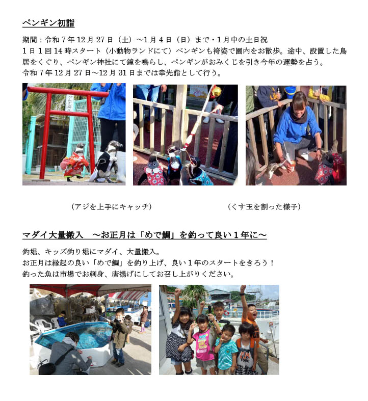 新春スペシャルイルカショーや、ペンギン初詣、豪華景品が当たるお年玉抽選会など新春ならではのイベントが盛りだくさん!小さなお子様からお年寄りまで楽しめる施設ですのでぜひ足を運んでみて下さいね♪