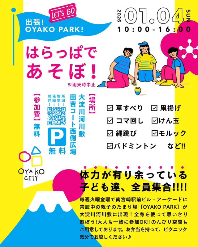 2026年1月4日(火)10:00から毎週火曜金曜で南宮崎駅前ビル・アーケードに常設中の親子のたまり場『OYAKO PARK』が大淀川河川敷に出現!