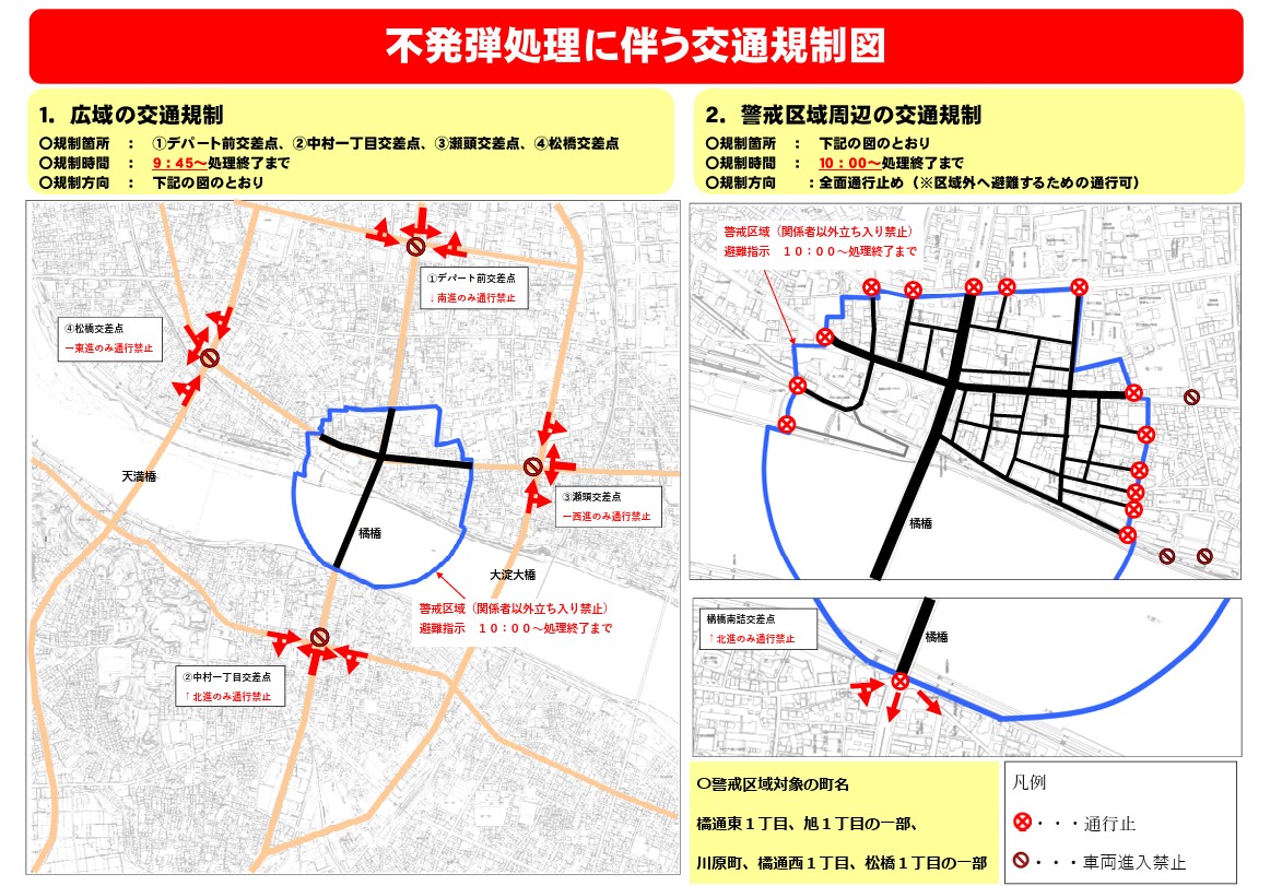 宮崎市の大淀川で見つかった不発弾の処理に伴い、宮崎市が当日の交通規制について詳細を発表した。
