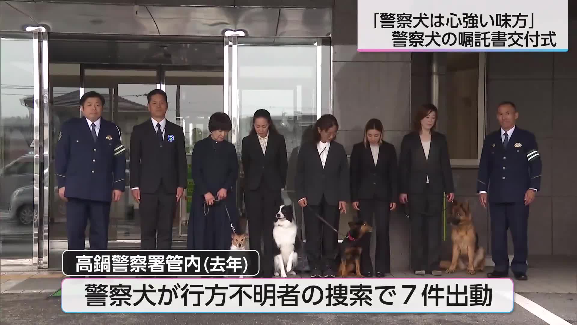 行方不明者の捜索などに出動する警察犬の嘱託書交付式が、高鍋警察署で行われました。警察犬の犬種もその特…