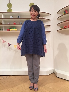 しなやかな履き心地のパンツに、春色のレースのチュニックブラウス。