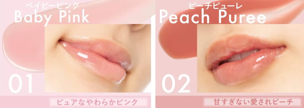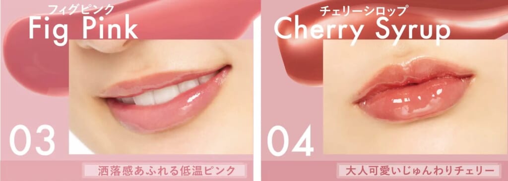 カラーは、「01 ベイビーピンク」「02 ピーチピューレ」「03 フィグピンク」「04 チェリーシロップ」の、唇にほんのり血色感と洒落感を添える4種のピンクカラー。