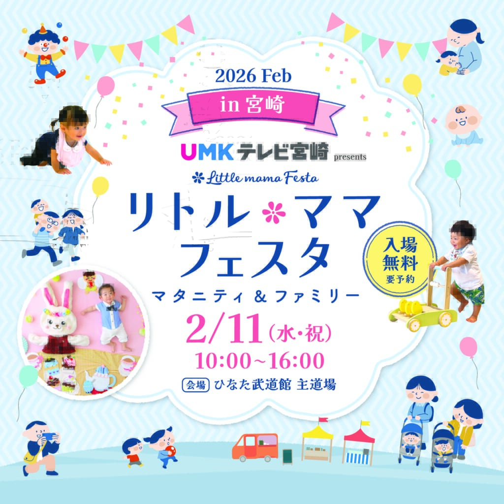 全国で年間65回以上開催され、毎年30万人以上のファミリーが来場する国内最大級の親子イベント「リトル・ママフェスタ」。その人気イベントが2026年2月11日(水・祝)に宮崎で開催されます!マタニティから未就学児ファミリーまで、親子で一日楽しめる体験型コンテンツが盛りだくさんのイベントですよ。