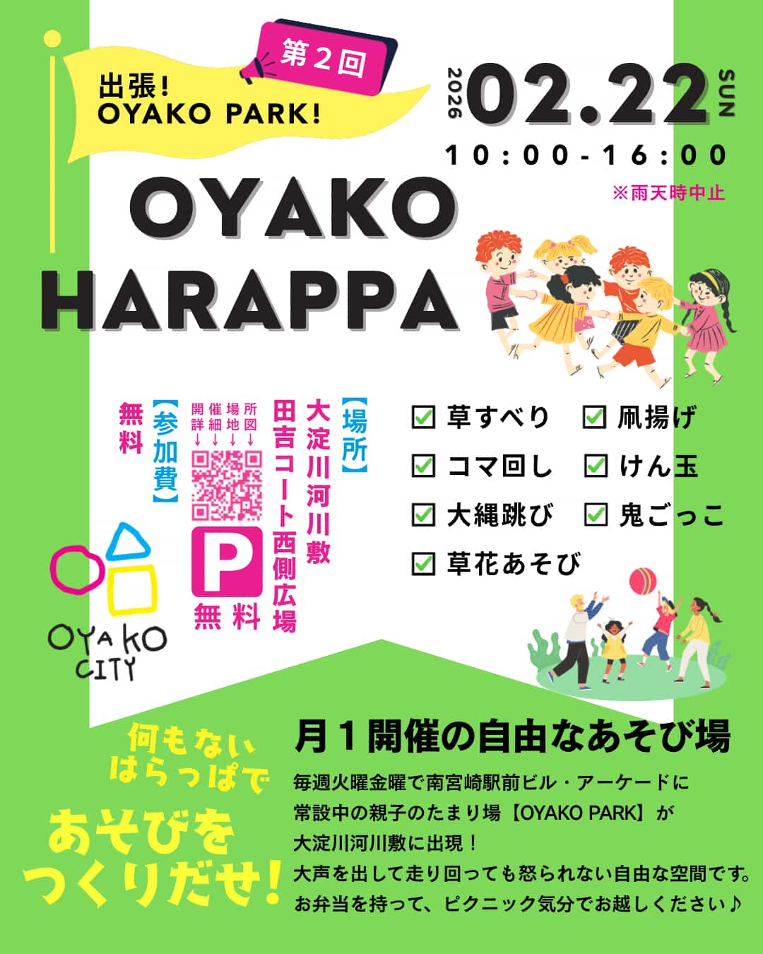 2月22日(日)に、大淀川河川敷にて「はらっぱであそぼ!出張OYAKO PARK」が開催されます♪草すべり、凧揚げ、縄跳びなど、遊び道具の用意もあるそうですよ♪親子で思いっきり外遊びができます🌟ぜひ、足を運んでみて下さいね!