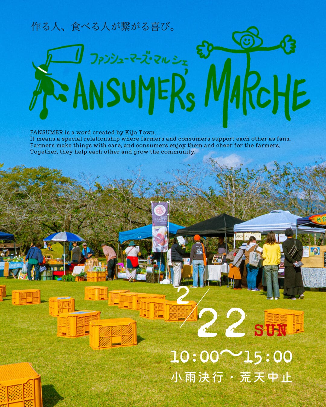 2月22日(日)に、木城町城山公園にて「FANSUMER’S MARCHE2026春」が開催されます♪宮崎県内から約30店舗が出展!ステージイベントやワークショップも楽しめますよ♪ぜひ、足を運んでみて下さいね!