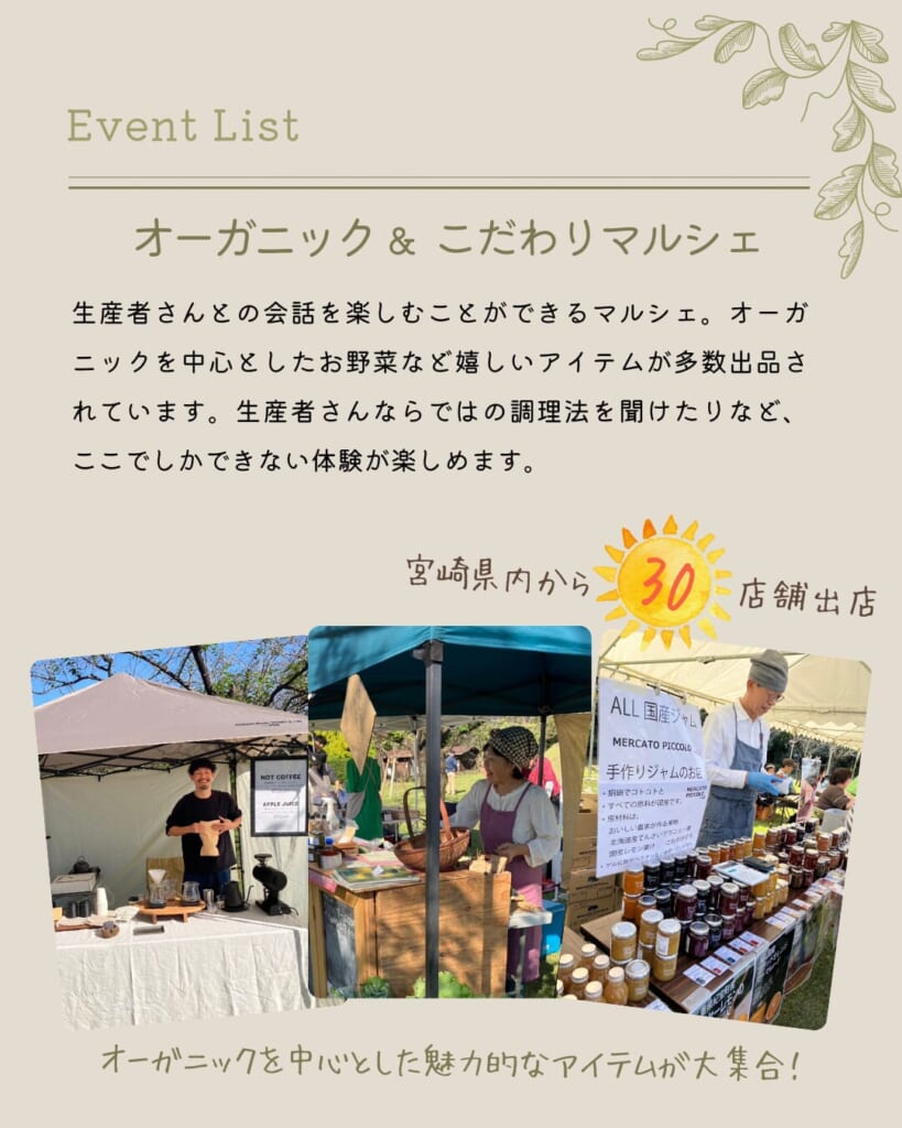 2月22日(日)に、木城町城山公園にて「FANSUMER’S MARCHE2026春」が開催されます♪宮崎県内から約30店舗が出展!ステージイベントやワークショップも楽しめますよ♪ぜひ、足を運んでみて下さいね!