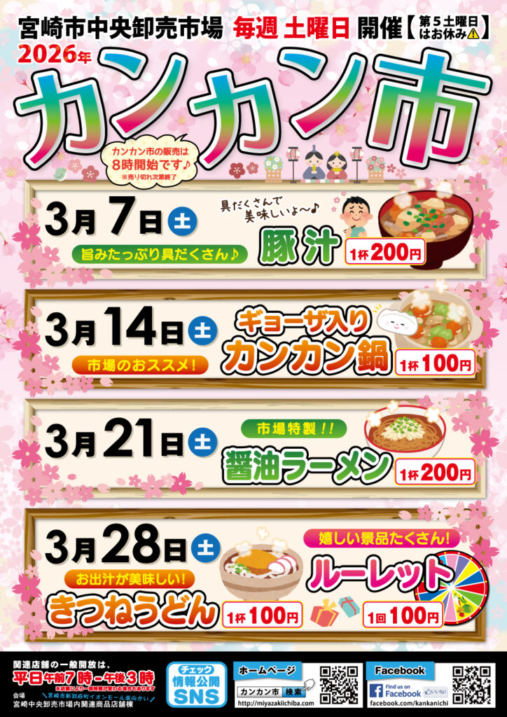 3月7日(土)宮崎市中央卸売市場にてカンカン市が開催されます!毎週土曜日に開催されるカンカン市は毎回多くの人で賑わい、旬のものや野菜たっぷり鍋の販売等、季節によって様々なイベントが行われています。