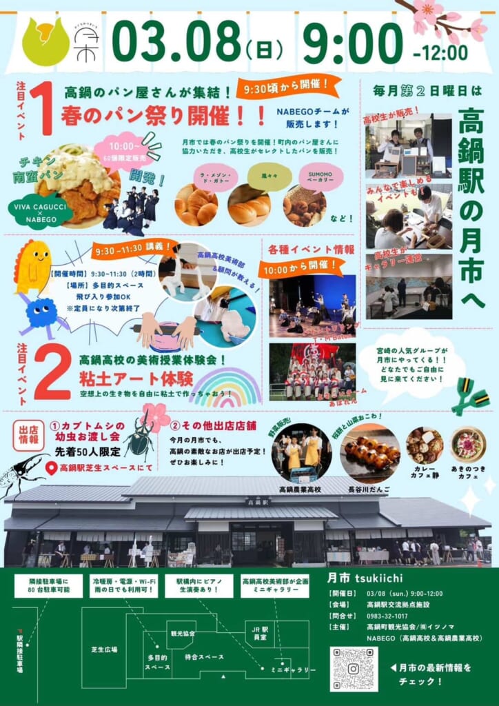 3月8日(日)に高鍋駅にて9:00~12:00「月市」が開催されます!注目イベントは、「春のパン祭り」。高校生がセレクトした高鍋のパン屋さんが集結しますよ♩その他、飛び入り参加OKの粘土アート体験や、野菜販売、地元の素敵なお店のグルメ等が楽しめます!