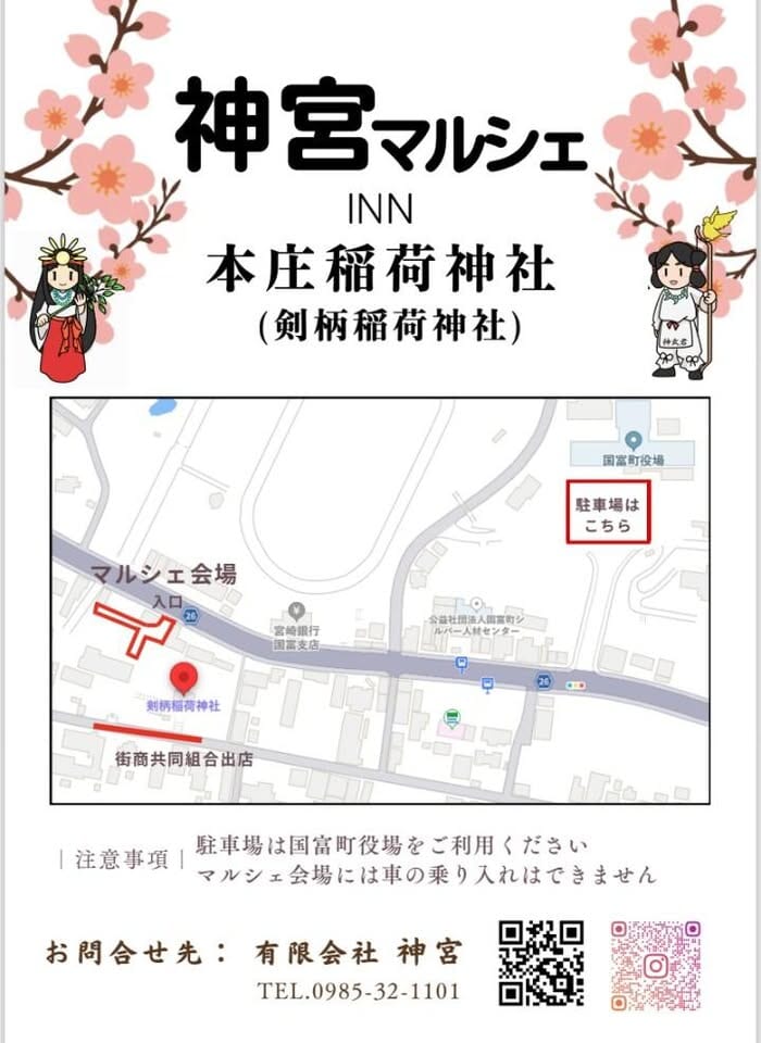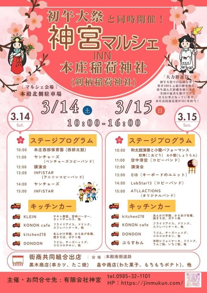 3月14日(土)~3月15日(日)国富町の「本庄稲荷神社」にて、神宮マルシェが開催されます!今回はなんと本庄稲荷神社「初午大祭」と「神宮マルシェ」がコラボして初の2日間開催✨今回もステージプログラムやキッチンカー等、小さい子供から大人まで楽しめるイベントが盛りだくさんです!