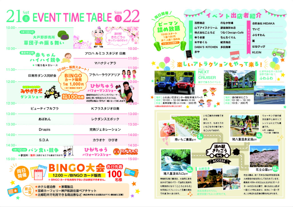 またイベント期間中の3月21日(土)、3月22日(日)は「道の駅きたごう」でも関連イベントが行われる予定です。キッチンカーの出店やバギー親子体験、赤ちゃんハイハイ競争など、お子様から大人まで楽しめる企画が用意されています!ぜひご家族で足をお運びください✨