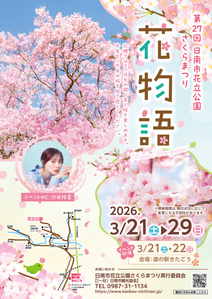 3月21日(土)~3月29日(日)に、日南市北郷町の花立公園では「さくらまつり花物語」が開催されます🌸このお祭りは1万本の桜が楽しめる春のお花見イベントとして実施され、毎年多くの人で賑わいますよ♪