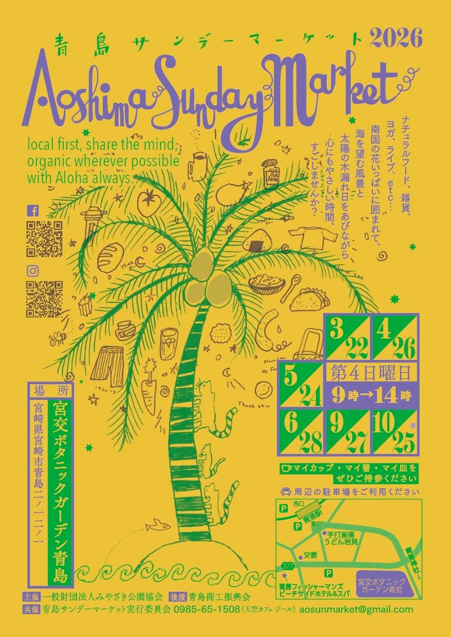 3月22日(日)に、ナチュラルオーガニックをテーマとした日曜市「青島サンデーマーケット」が宮交ボタニックガーデン青島にて開催されます!地元素材を活かした食べもの、飲み物、ハンドメイドや環境に配慮された雑貨、癒しのリラクゼーション、ワークショップなどのお店、音楽ライブも楽しめますよ!