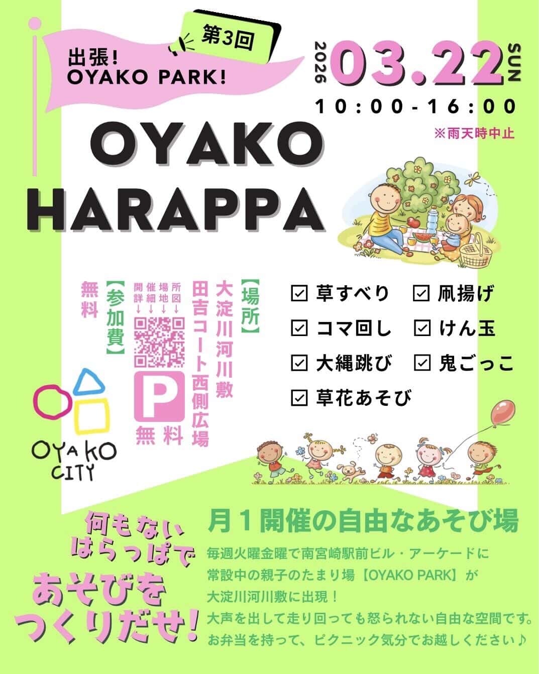 3月22日(日)に、大淀川河川敷にて第3回「はらっぱであそぼ!出張OYAKO PARK」が開催されます♪草すべり、凧揚げ、大縄跳びなど、遊び道具の用意もあるそうですよ♪親子で思いっきり外遊びができます🌟ぜひ、足を運んでみて下さいね!