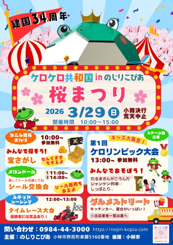 3月29日(日)にのじりこぴあにて「ケロケロ共和国inのじりこぴあ桜まつり」が開催されます!会場では、宝探しやシール交換会などの楽しいイベントのほか、キッチンカーや屋台も多数出店。子どもから大人まで楽しめるイベントですので、ぜひ足を運んでみて下さいね♪