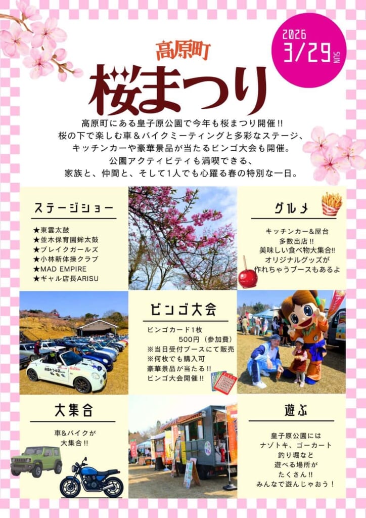 3月29日(日)に皇子原公園にて「桜まつり2026」が開催されます!ステージショーやビンゴ大会などのイベントの他、キッチンカーや個性あふれる車&バイクが大集合♪