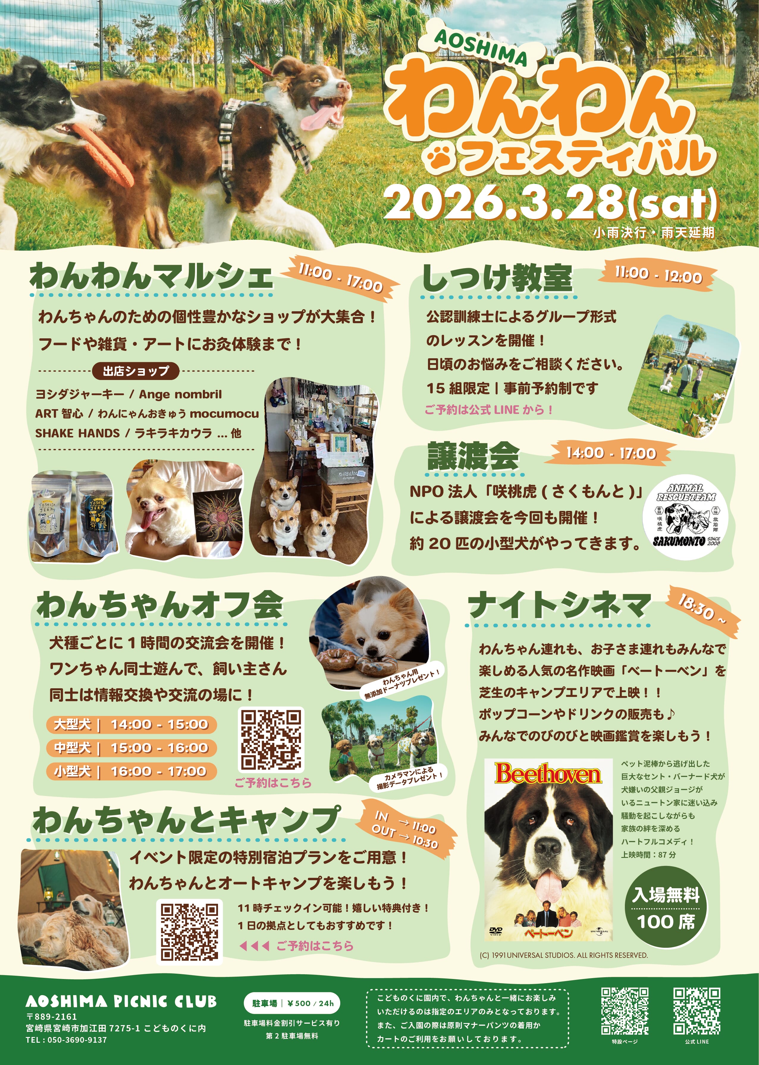 3月28日(土)にAOSHIMA PICNIC CLUBにて「青島わんわんフェスティバル」が開催されます!わんちゃん向けのおやつやごはん、グッズやおめかしアイテムが集まったわんわんマルシェや、しつけ教室、わんちゃん同士で楽しく遊び、飼い主さん同士で情報交換を行うわんちゃんオフ会など盛りだくさん🐶🌟