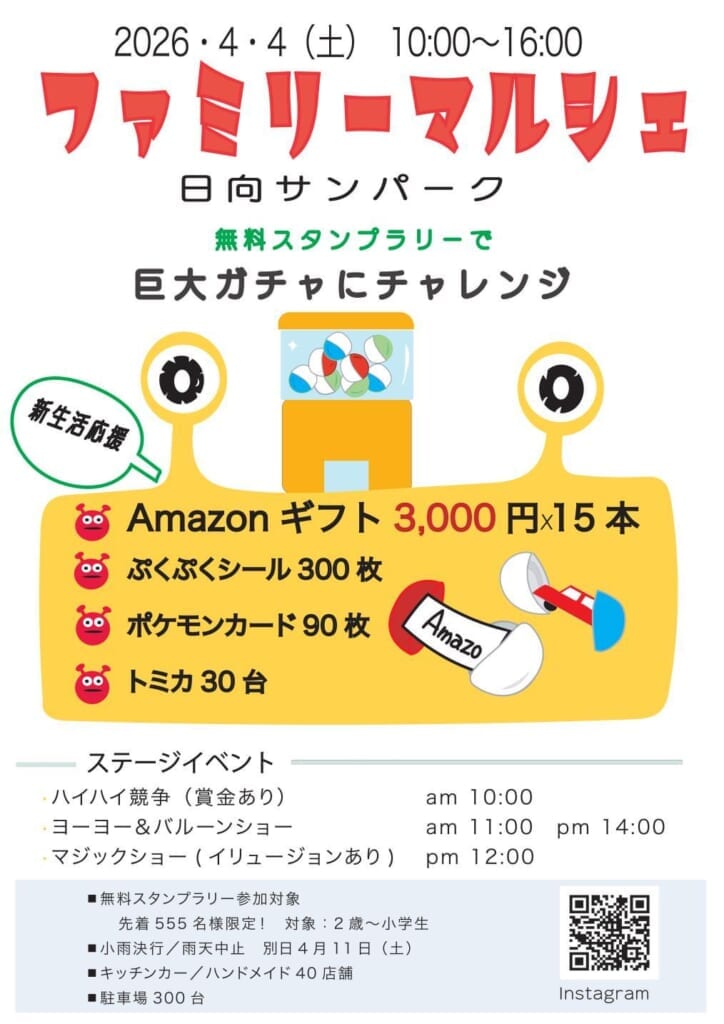 4月4日(土)日向サンパークにて、子どもたちが主役の体験型イベント「ファミリーマルシェ」開催!先着555名限定で参加できるスタンプラリーを実施。スタンプをすべて集めると…”約2メートルの巨大ガチャ”に挑戦できます!