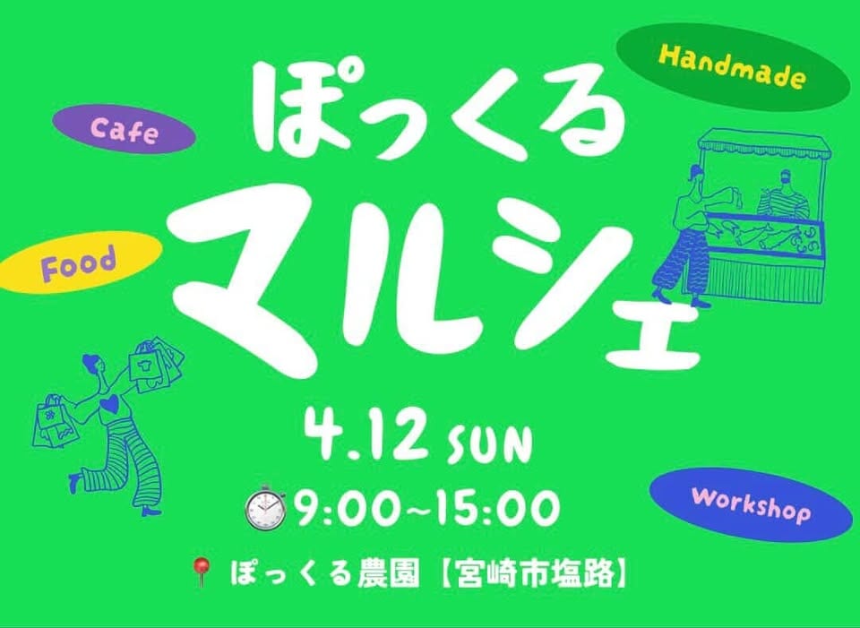 4月12日(日)宮崎市塩路のぽっくる農園にて「ぽっくるマルシェ」が開催されます✨ハンドメイド雑貨の販売、ワークショップ、リラクゼーションや占いなど、様々な企画が楽しめます♪