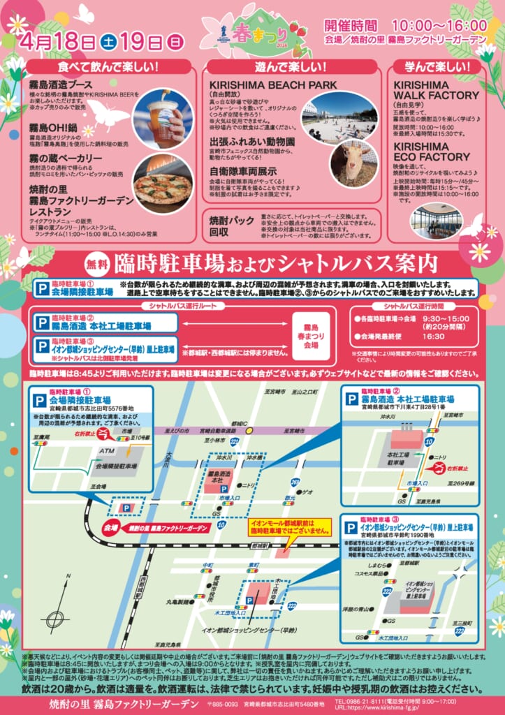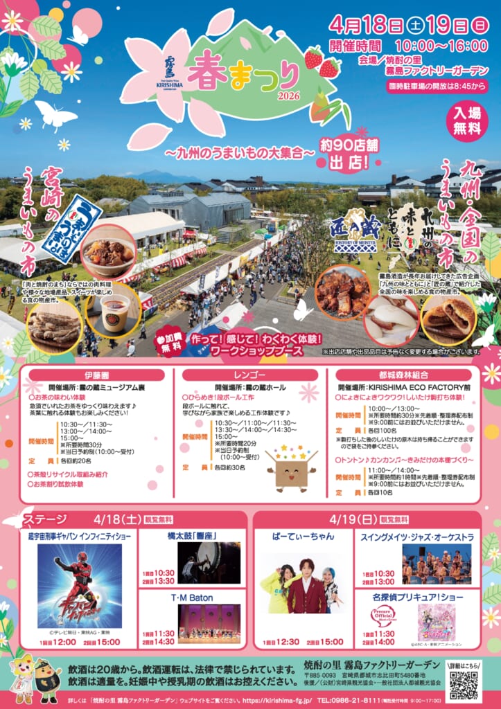 4月18日(土)、4月19日(日)の2日間、焼酎の里 霧島ファクトリーガーデン(都城市志比田町5480 番地)にて、「霧島春まつり2026~九州のうまいもの大集合~」が開催されます🌷