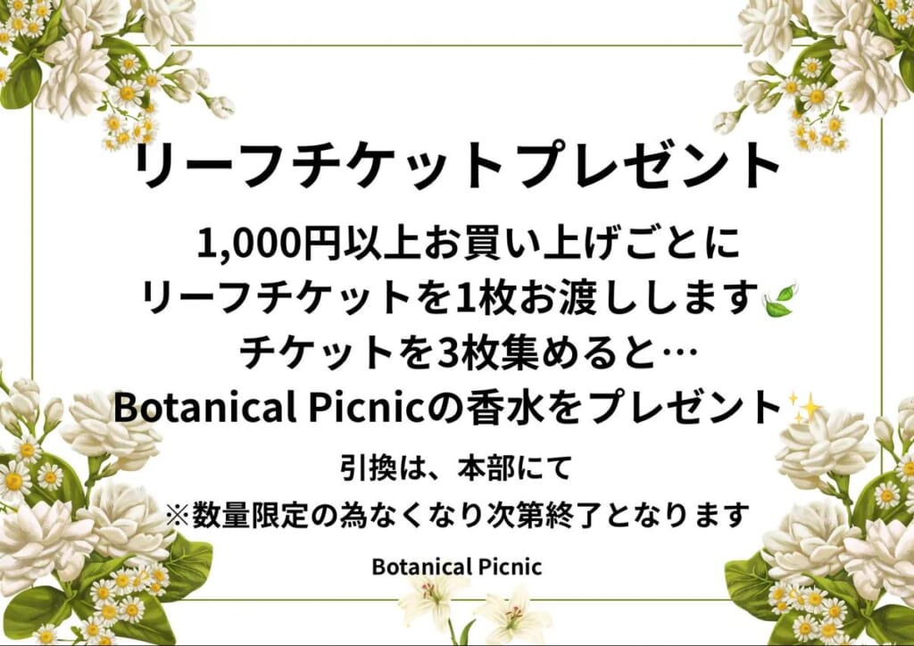 1000円購入ごとにリーフチケットが1枚もらえます✨それを3枚集めると「Botanical Picnic」の香水をプレゼント🎁ぜひ参加してみてくださいね。