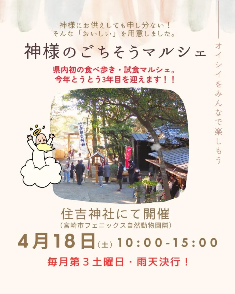 4月18日(土)住吉神社(宮崎市フェニックス自然動物園隣)にて「神様のごちそうマルシェ」が開催されます。このマルシェは神様のもとに集う宮崎の”美味しい”が集まった「食べ歩き、試食マルシェ」です🍴