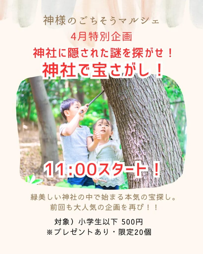 さらに!11:00~前回大好評だった特別企画『神社に隠された謎を探せ!神社で宝さがし!』が開催されます✨本気の宝探しにチャレンジしてみてくださいね♪