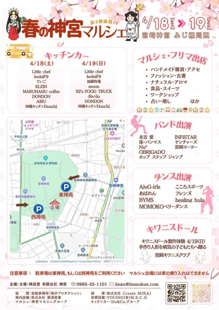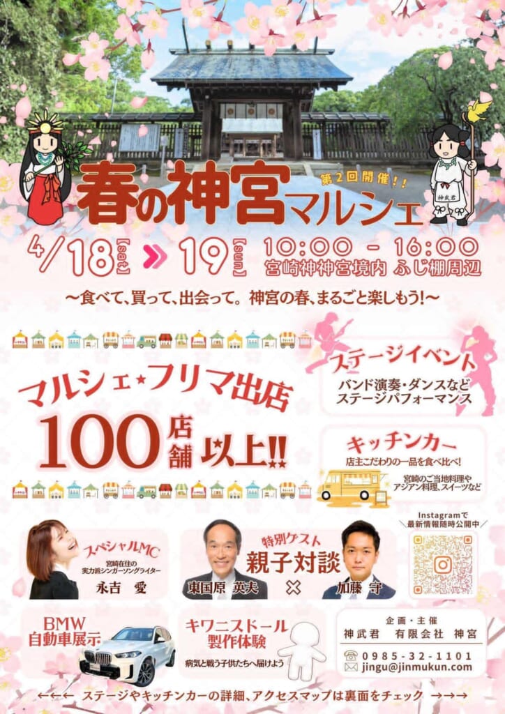 4月18日(土)~4月19日(日)宮崎神宮境内の「ふじ棚」周辺にて、「春の神宮マルシェ」が開催されます🌷MCは宮崎在住の実力派シンガーソングライター永吉愛さん。さらに…!?東国原英夫さんと加藤守さんの親子対談等もあります♪