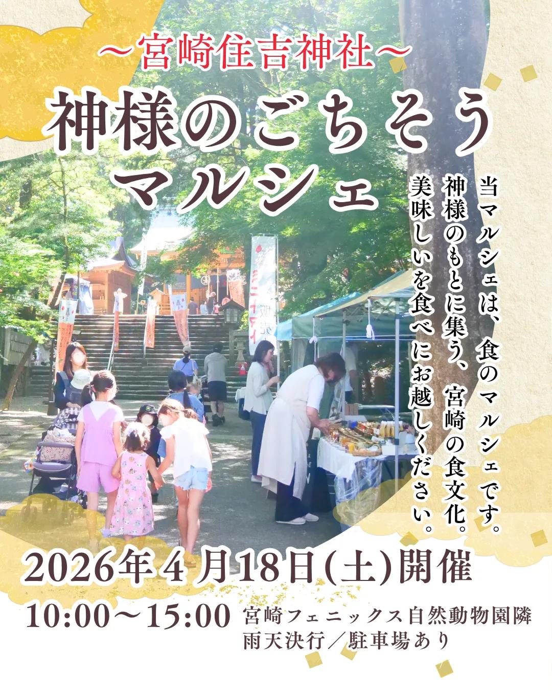 4月18日(土)住吉神社(宮崎市フェニックス自然動物園隣)にて「神様のごちそうマルシェ」が開催されます。このマルシェは神様のもとに集う宮崎の”美味しい”が集まった「食べ歩き、試食マルシェ」です🍴