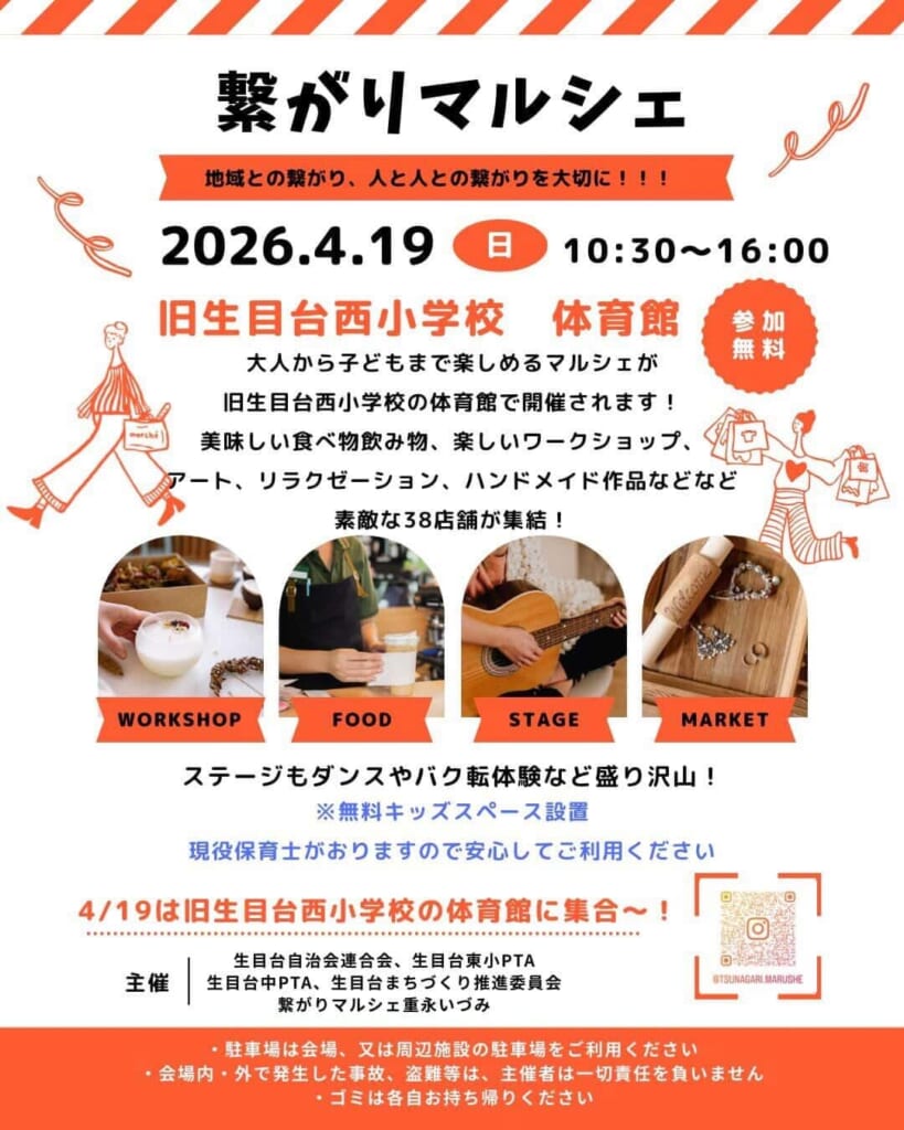 4月19日(日)10:30~16:00に旧生目台西小学校体育館にて『繋がりマルシェ』が開催されます。美味しい飲み物、食べ物、楽しいワークショップ、ハンドメイド作品、アート、リラクゼーション等、30店舗が集合します!✨年代問わず楽しめるマルシェです☕