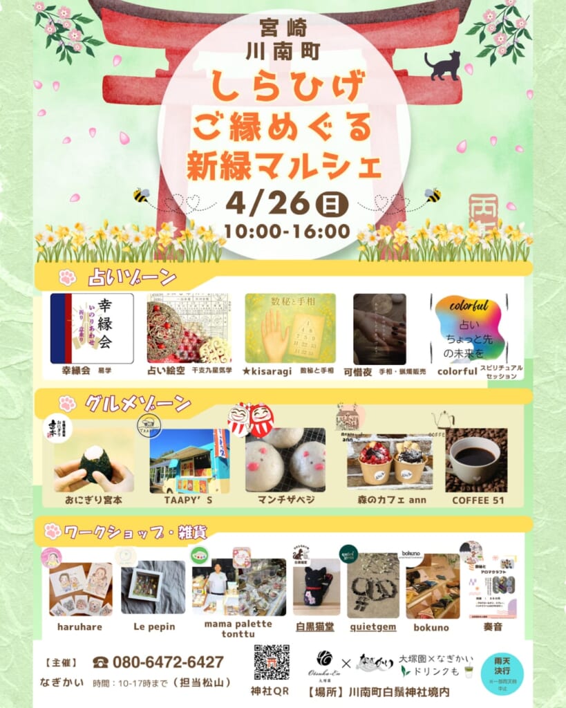 また、会場内では「譲渡型保護ハウス日向ぼっこ」の保護猫譲渡会も開催されます🐈神社で暮らす猫ちゃんたちとの心温まるふれあいもお楽しみください。爽やかな春風が吹き抜ける境内で、新しい出会いや楽しみを見つけませんか?✨