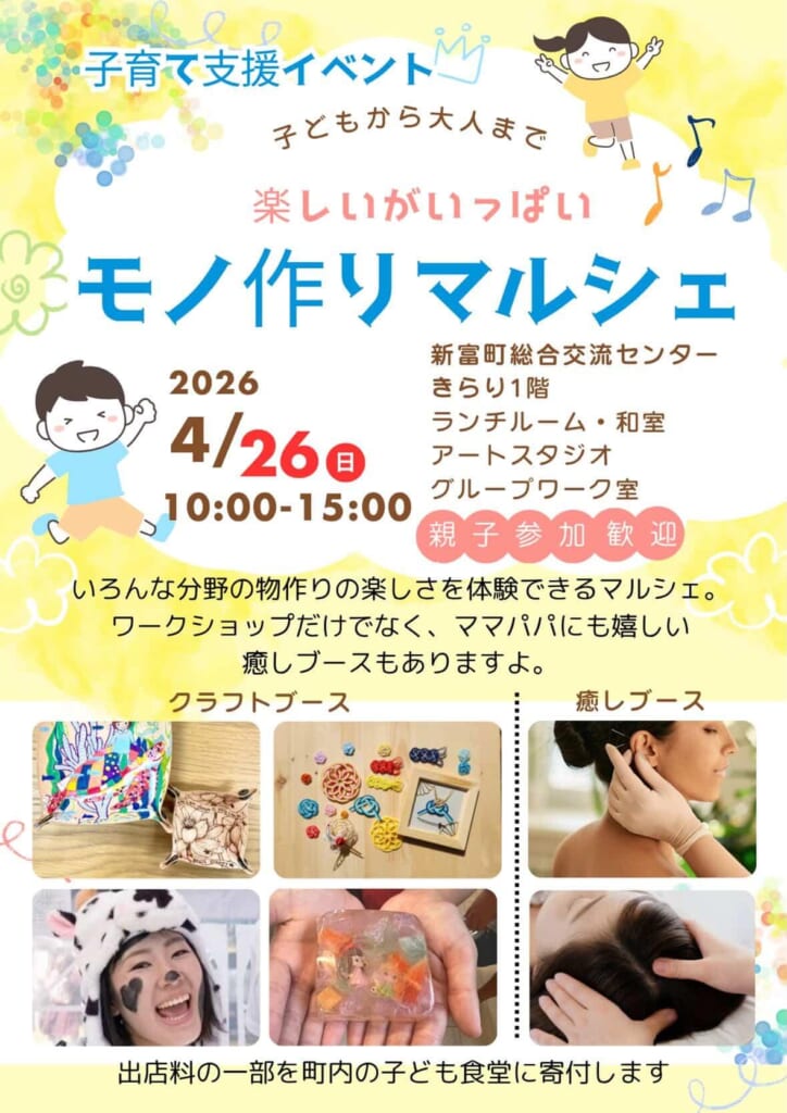4月26日(日)、新富町総合交流センターきらり(児湯郡新富町大字上富田6345-5)にて、子育て支援イベント「第2回モノ作りマルシェ」が開催されます👶✨
