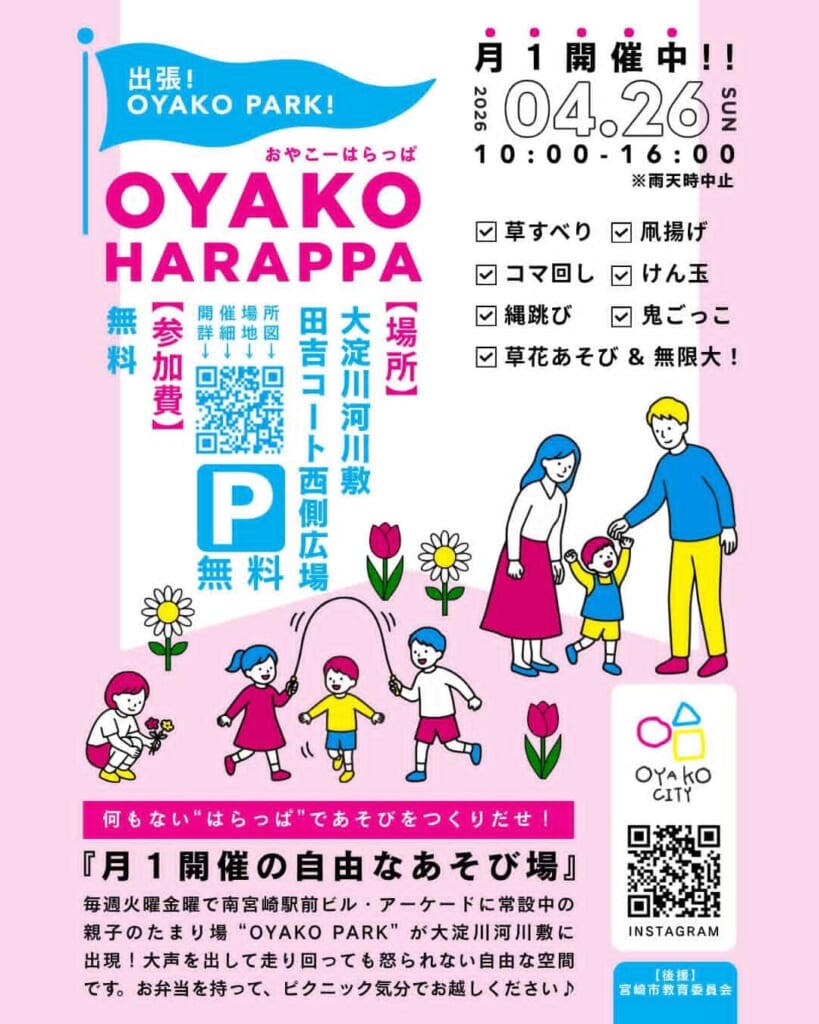 4月26日(日)、大淀川河川敷 田吉コート西側広場にて「OYAKO HARAPPA(おやこーはらっぱ)」が開催されます🌷「大きな声を出しても、走り回っても、ボール遊びをしても怒られない」そんな自由な空間で、子どもも大人も思いきり体を動かしませんか?✨