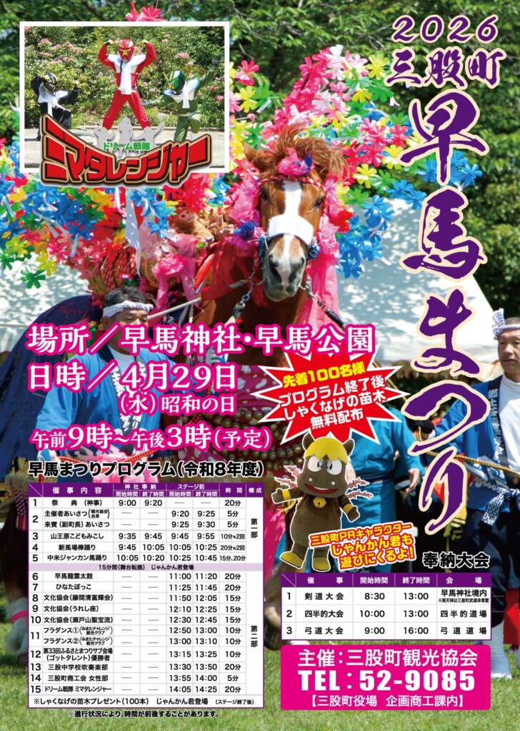 当日は、早馬神社境内で五穀豊穣を祈願する「ジャンカン馬踊り」をはじめ、町内各地の郷土芸能が奉納されます。奉納後には、各地区に繰り出して踊りを披露する「庭もどし」も行われ、地域に受け継がれてきた伝統を間近で感じることができますよ😊また、ステージでは町内グループによる踊りやダンス、ご当地ヒーロー「みまたレンジャー」ショーも開催予定。さらに、弓道・剣道・四半的・柔道の奉納大会も同時に行われ、見どころたっぷりの一日です✨