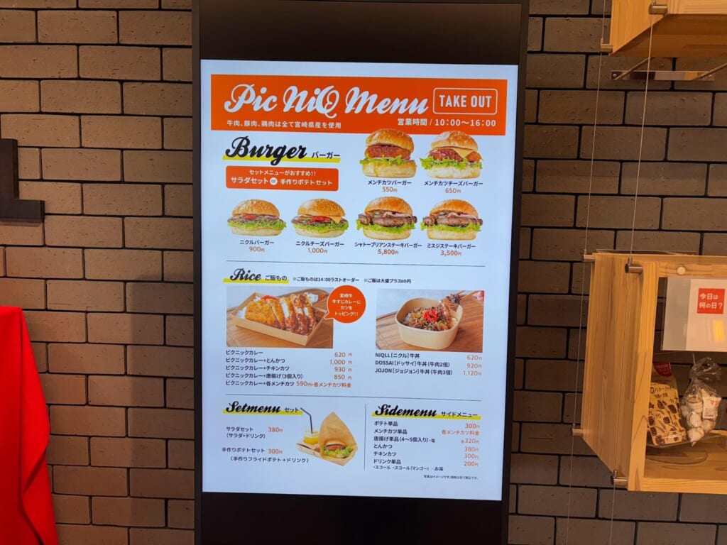 「PicNiQ」は都城メンチが日替わりで5種類食べられるほか、ハンバーガーなどのカフェメニュー、宮崎牛を使用したお弁当など、しっかり食べたい人には良さそうでした。