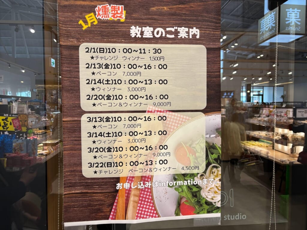 館内には、燻製づくりなどが体験できるキッチンスタジオがあります。この日は体験の実施日ではなかったため実際の様子は見られませんでしたが、掲示されていた案内を見ると、ウインナーやベーコンなどを作れるプログラムが定期的に開催されているようでした。
