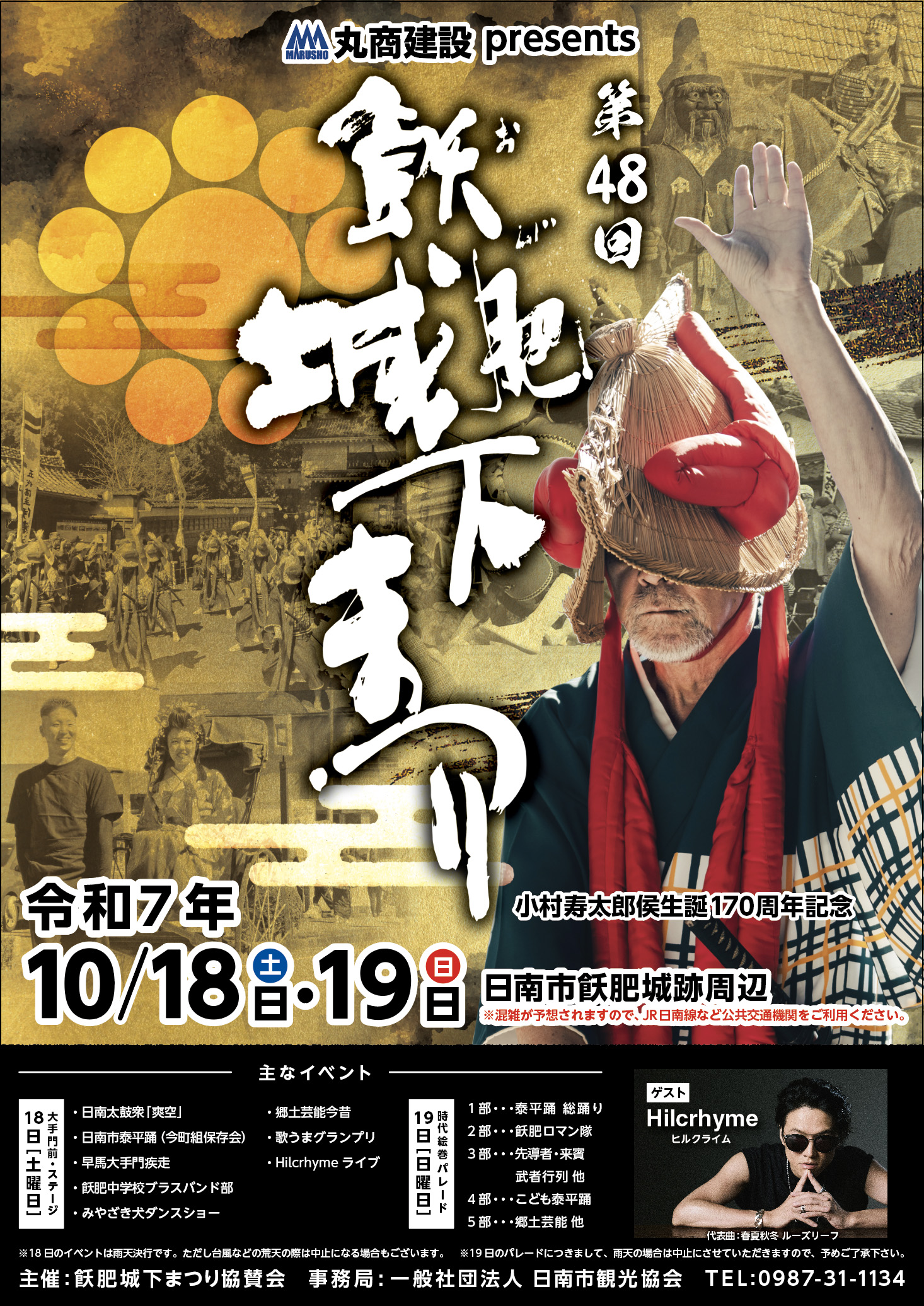 日南市では10月18日(土)-10月19日(日)に丸商建設presents第48回「飫肥城下まつり」が2日間にわたって盛大に開催されます!1日目には郷土舞踊「泰平踊」の披露など多様なイベントが行われ、夜には「Hilcrhyme」のライブもありますよ🎤また、ポニーの乗馬体験やふれあいえさやりコーナーなど子どもが楽しめるコンテンツも盛りだくさん!