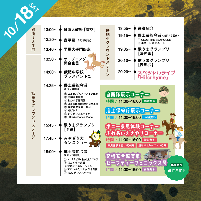 日南市では10月18日(土)-10月19日(日)に丸商建設presents第48回「飫肥城下まつり」が2日間にわたって盛大に開催されます!1日目には郷土舞踊「泰平踊」の披露など多様なイベントが行われ、夜には「Hilcrhyme」のライブもありますよ🎤また、ポニーの乗馬体験やふれあいえさやりコーナーなど子どもが楽しめるコンテンツも盛りだくさん!