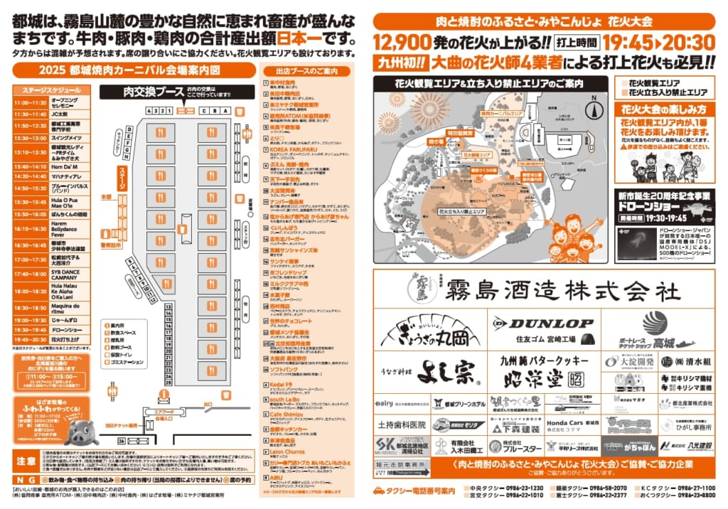 お肉はもちろん、都城の特産品や料理も楽しめます。多様なステージイベントや子どもに大人気のふわふわ、そして19時45分からは12,900発の花火が打ちあがります!九州初、大曲の花火師4業者による打ち上げ花火も必見!
