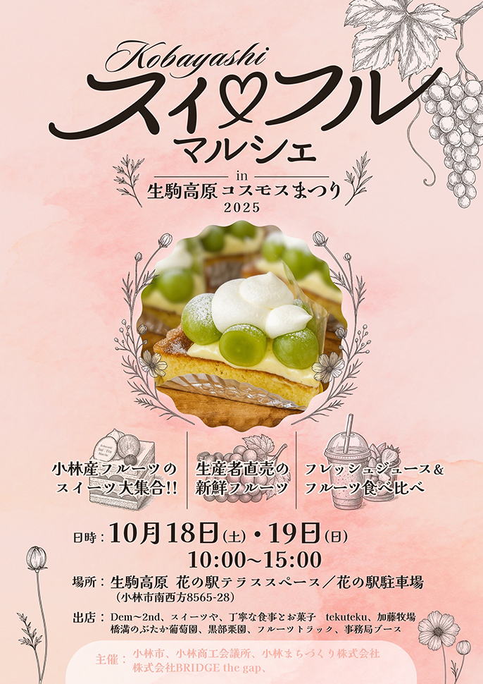 生駒高原では9月27日(土)~10月26日(日)まで小林市の秋の風物詩「コスモスまつり」が開催中。食欲の秋に嬉しいフードガーデンやマルシェ、物産市などもありますよ♪今週末は「スイフルマルシェ」!小林県産のぶどう、梨、栗で彩る秋マルシェが開催されますよ♪ぜひ足を運んでみて下さいね。