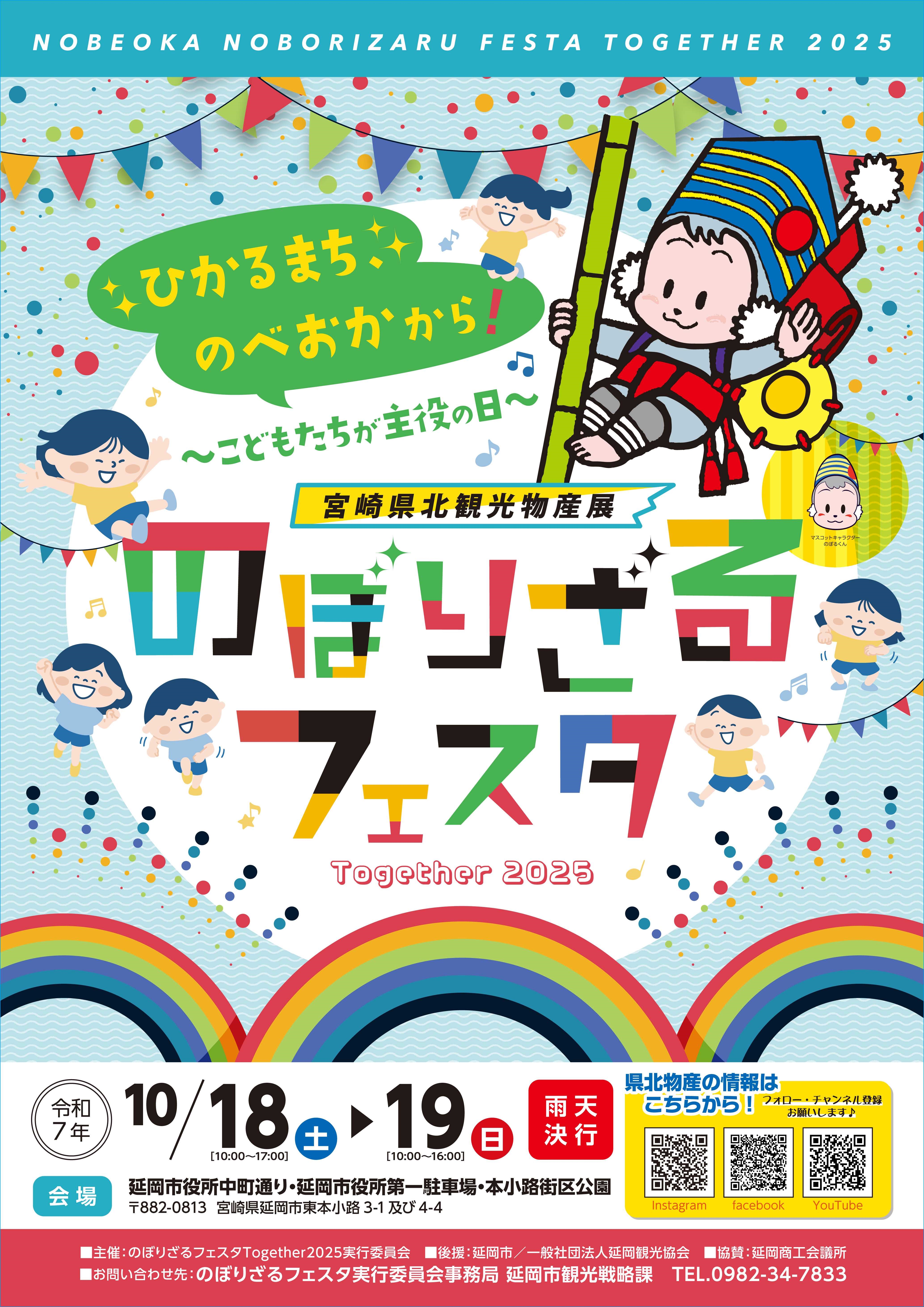 延岡市では、「のぼりざるフェスタTogether2025」が開催されます!今年のテーマは~ひかるまちのべおかから!こどもたちが主役の日~。延岡市を中心とした県北からの物産品の販売や、本市の伝統工芸品「のぼり猿」にちなんだ「わんぱくのぼりざる」や、延岡の食を代表する鮎を捕まえる「鮎のつかみ取り」などの恒例イベント、ワークショップやクイズ大会など多数のイベントが実施されます。ぜひ足を運んでみて下さいね!