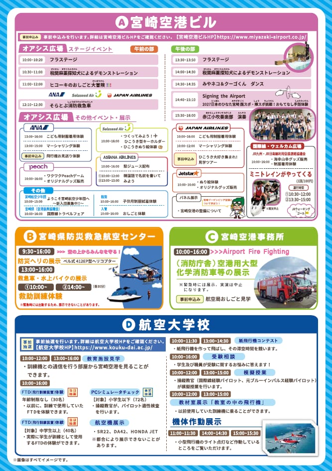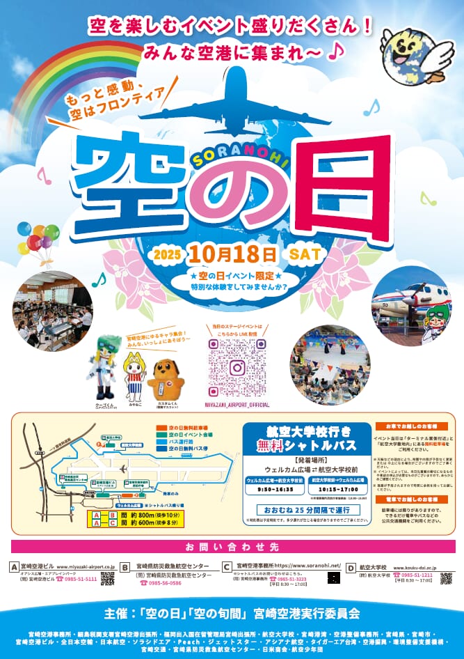 宮崎ブーゲンビリア空港1階オアシス広場では、各エアラインのブースにて子ども用制服着用体験やマーシャリング体験など様々なイベントが楽しめる「空の日」が開催されます。空港周辺でも空港用大型消防車・防災ヘリ・救急車・水上バイク等の展示や放水・消火作業の実演もありますよ♪ぜひ足を運んでみて下さいね!