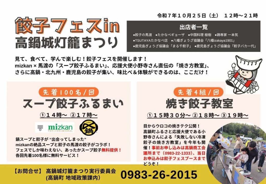 会場には約8千基の灯籠が灯り幻想的なフォトスポットが誕生!豊富なグルメやステージイベントも楽しめますよ♪餃子フェスも開催され、高鍋町内の餃子屋さんだけでなく、なんと北九州市と鹿児島市からも3店舗が出店!馴染みの餃子と県外の餃子の食べ比べができますよ♪子どもからお年寄りまで楽しめるイベントですので、ぜひ足を運んでみて下さいね!