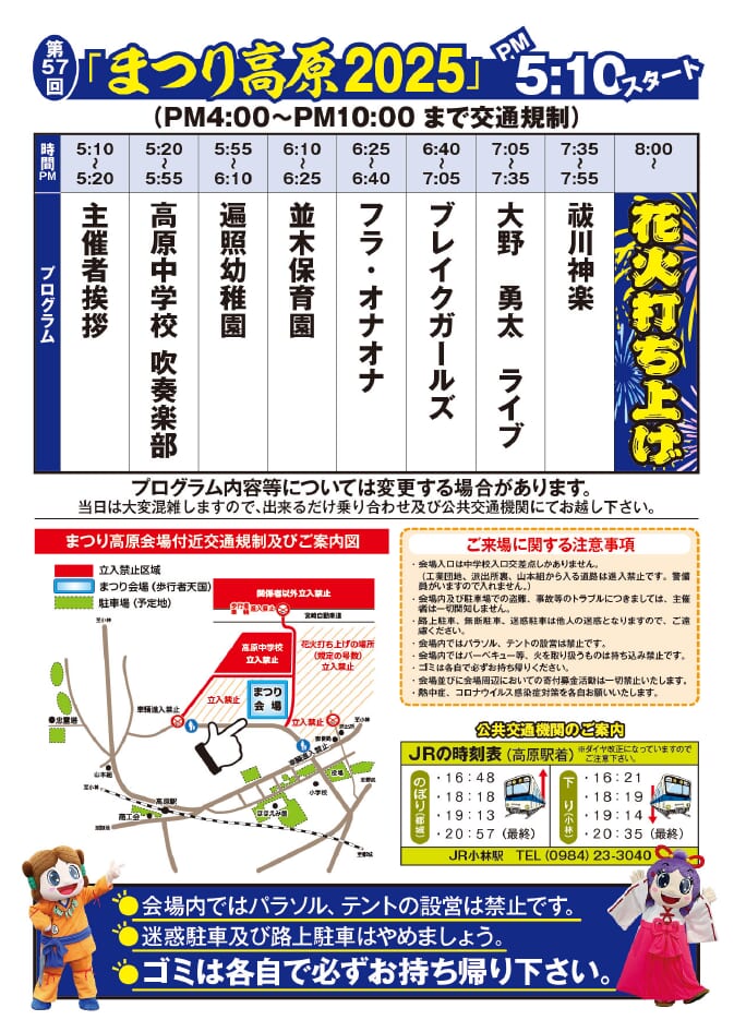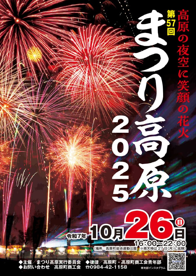 高原町では10月26日(日)に第57回「まつり高原」が開催されます!フィナーレには夜空を美しく彩る花火も楽しめますよ。当日は交通規制が行われますのでできるだけ公共交通機関をご利用下さい。家族、友人、恋人とぜひ足を運んでみて下さいね♪