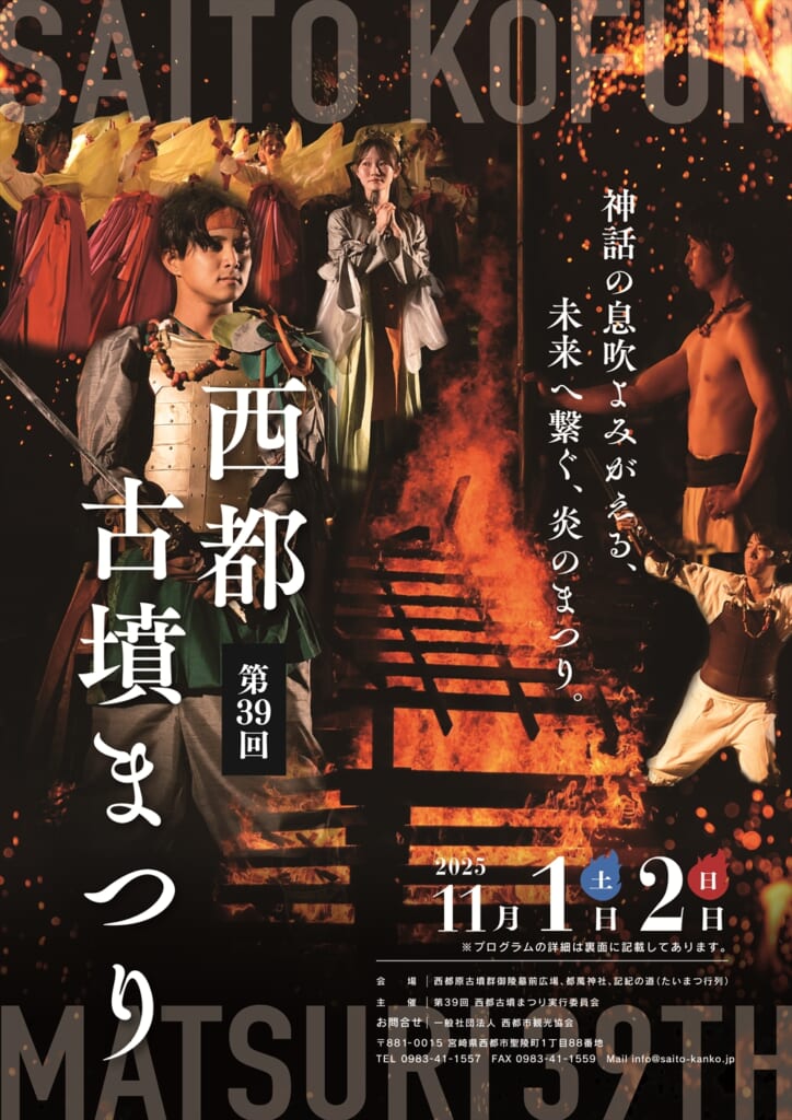 西都原古墳群の御陵墓前広場では11月1日(土)-11月2日(日)に第39回「西都古墳まつり」が開催されます!初日の見どころは、一般参加が可能な「たいまつ行列」。古代衣装をまとった約500名の人々がグッドデザイン賞を受賞した「記紀の道」を歩きます。もう一つの見どころは、西都の神話絵巻を舞と音楽で再現した「炎の祭典」です。高さ約3メートルのやぐらに火をともし、古代衣装を身に着けた武人や女人が舞う姿は幻想的なイベントです。