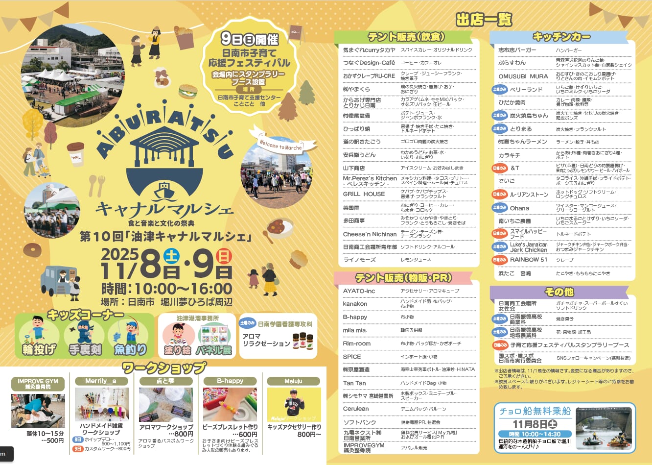 日南市堀川夢ひろば周辺では11月8日(土)-9日(日)に食と音楽と文化の祭典、第10回「油津キャナルマルシェ」が開催されます!ステージイベントはもちろん、キッズコーナーやワークショップ、抽選会など盛りだくさん!