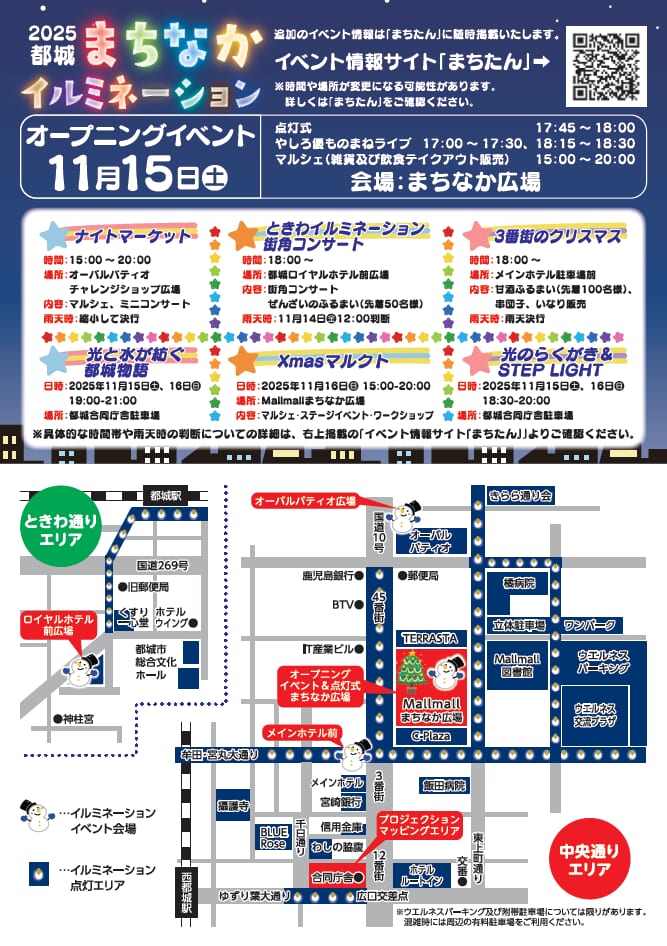 都城市では冬の風物詩として定着した、「都城まちなかイルミネーション」が今年も開催されます!11月15日(土)にはまちなか広場にてオープニングイベントを実施。やしろ優さんによるものまねライブやナイトマーケット、プロジェクションマッピングなど盛りだくさん!