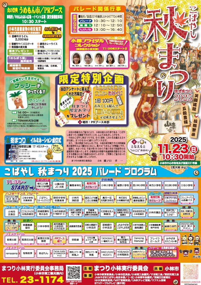 小林市では11月23日(日)に小林市最大のお祭り「こばやし秋まつり」が開催されます!「こばやし秋まつり」は、五穀豊穣を祈願し、豊年に感謝する伝統行事です。毎年11月23日(勤労感謝の日)、老若男女が小林市中心市街地を練り歩き、こばやし秋まつり一色で沸き返ります。