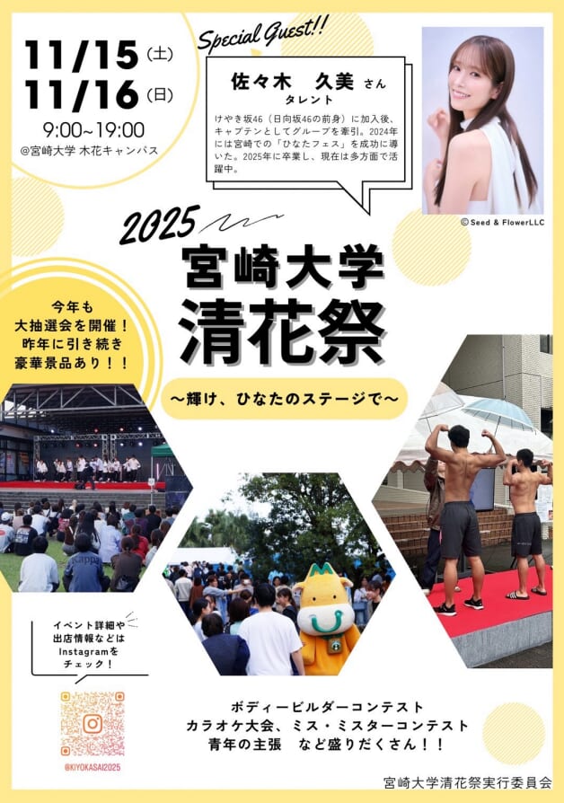 宮崎大学では11月15日(土)-11月16日(日)に大学祭・第21回「清花祭」が開催されます!今年のスローガンは「輝け、ひなたのステージで」🌟