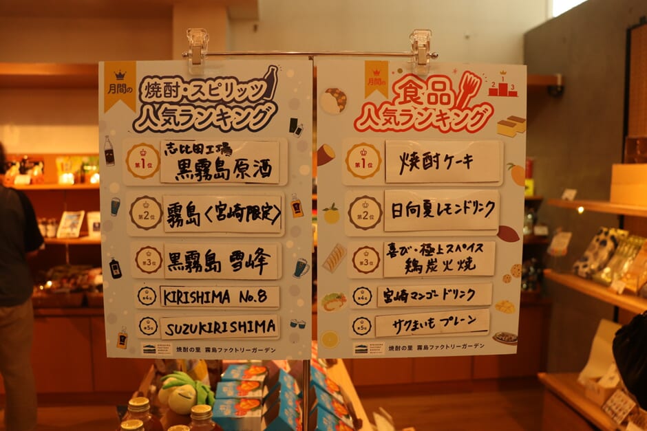 おつまみ好きには「タマチャンショップ」との共同開発によって埋めれた芋けんぴ「サクまいも」や「オサカーナ(サクまいもミックス)」が人気です。金印グラスや黒霧島Tシャツといったオリジナル雑貨も充実しており、「何を買って帰ろうかな」と迷う時間も楽しいひとときです。