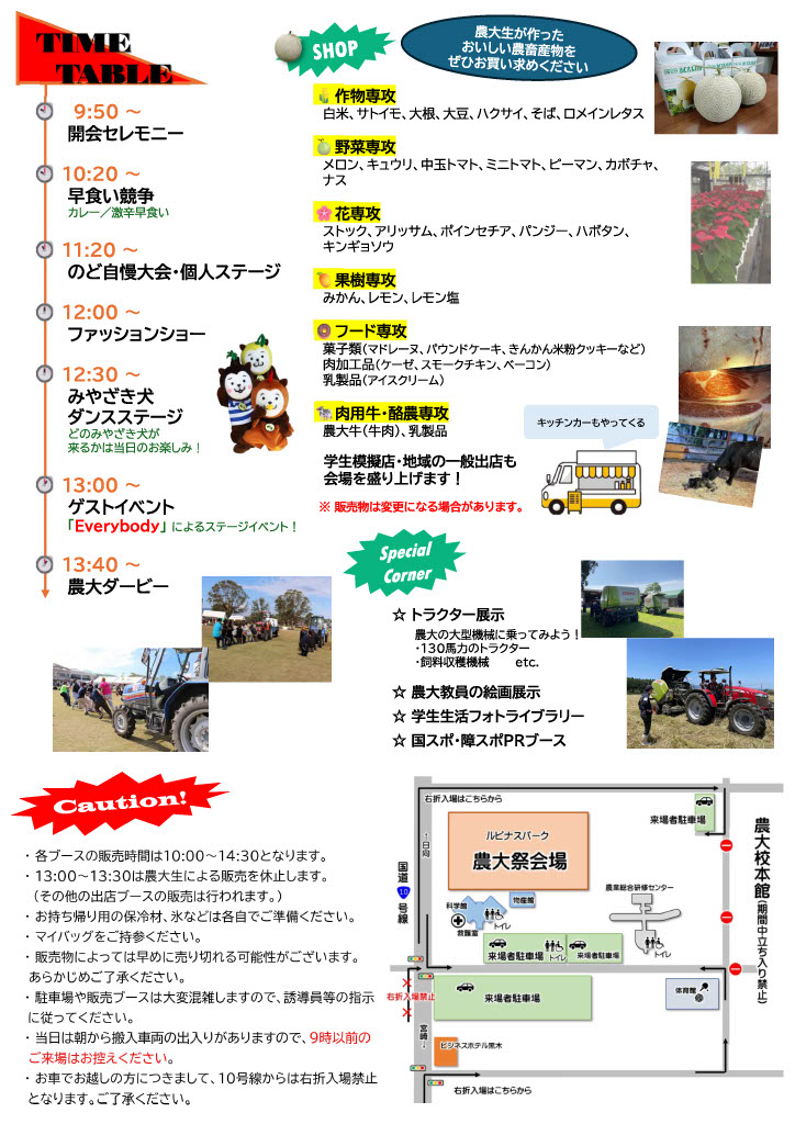 さらに、今年はみやざき犬のダンスショーや農大のトラクター展示など子どもが楽しめるコンテンツも盛りだくさん!ぜひ足を運んでみて下さいね♪